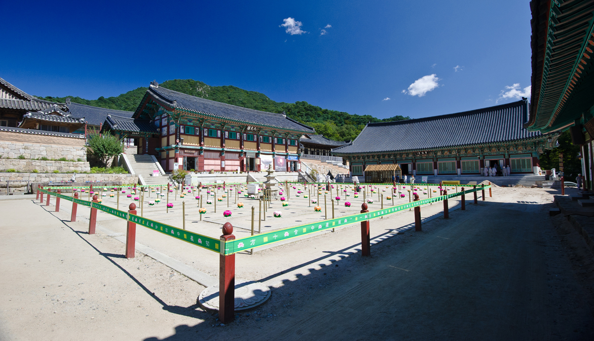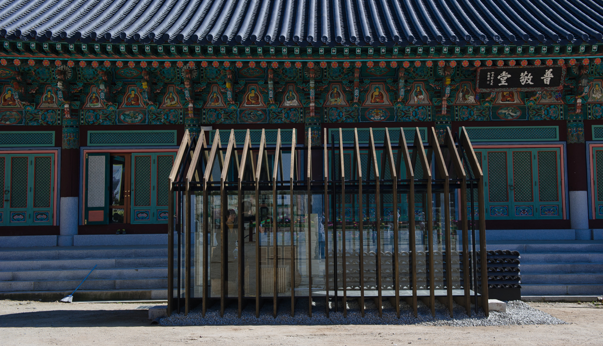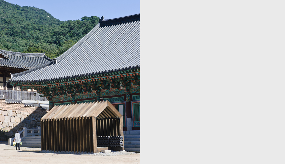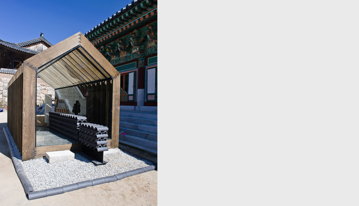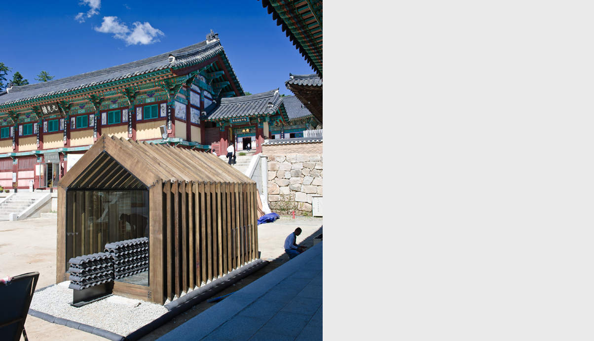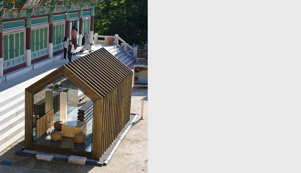 주된 디자인 의도는 자연에 자연스럽게 배치된 기존 해인사의 아름다운 경관을 해치지 않도록, 제 형태를 갖고 완성된 경계를 갖는 물체로 보이지 않도록 하는 것이 파빌리온의 주개념이다. 따라서 파빌리온은 가장 정직하고 기본적인 절의 외형을 단순화 한 후, 지붕과 처마를 구축하기 위해 절의 건축이 갖는 자연스러운 결의 방향인 수직의 켜로 해체한다. 이로써 형태는 다시 경관과 중첩되어 재 구축됨으로서 경관과 그 경계를 규정짓지 않는 모습을 갖게 된다.