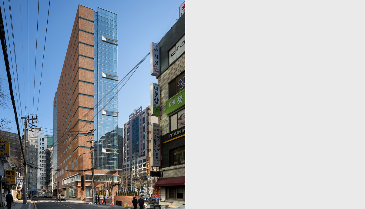 서초동의 이 부지는 건물이 로마신화에 나오는 야누스처럼 앞뒤에 두가지 표정을 갖어야하는 위치에 있다. 전면은 30M 서초대로에 면해있어 오피스 빌딩과 같이 도시적인 이미지, 그리고 후면은 14M도로 너머로 바로 이어지는 주거지역에서 온화하게 바라 보일 수 있고 시각적으로 차단될 수 있는 입면이 요구되는 위치에 놓여있다.