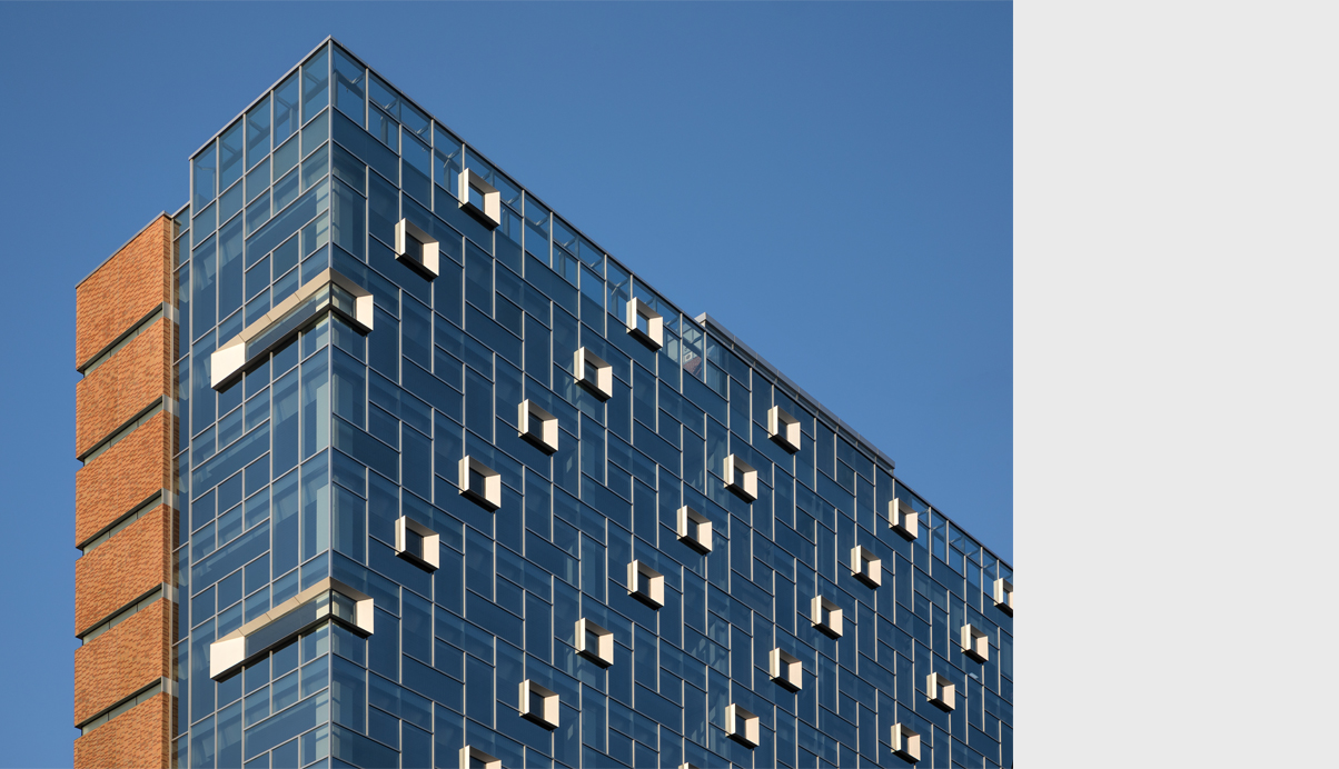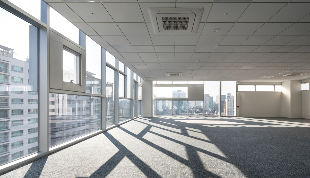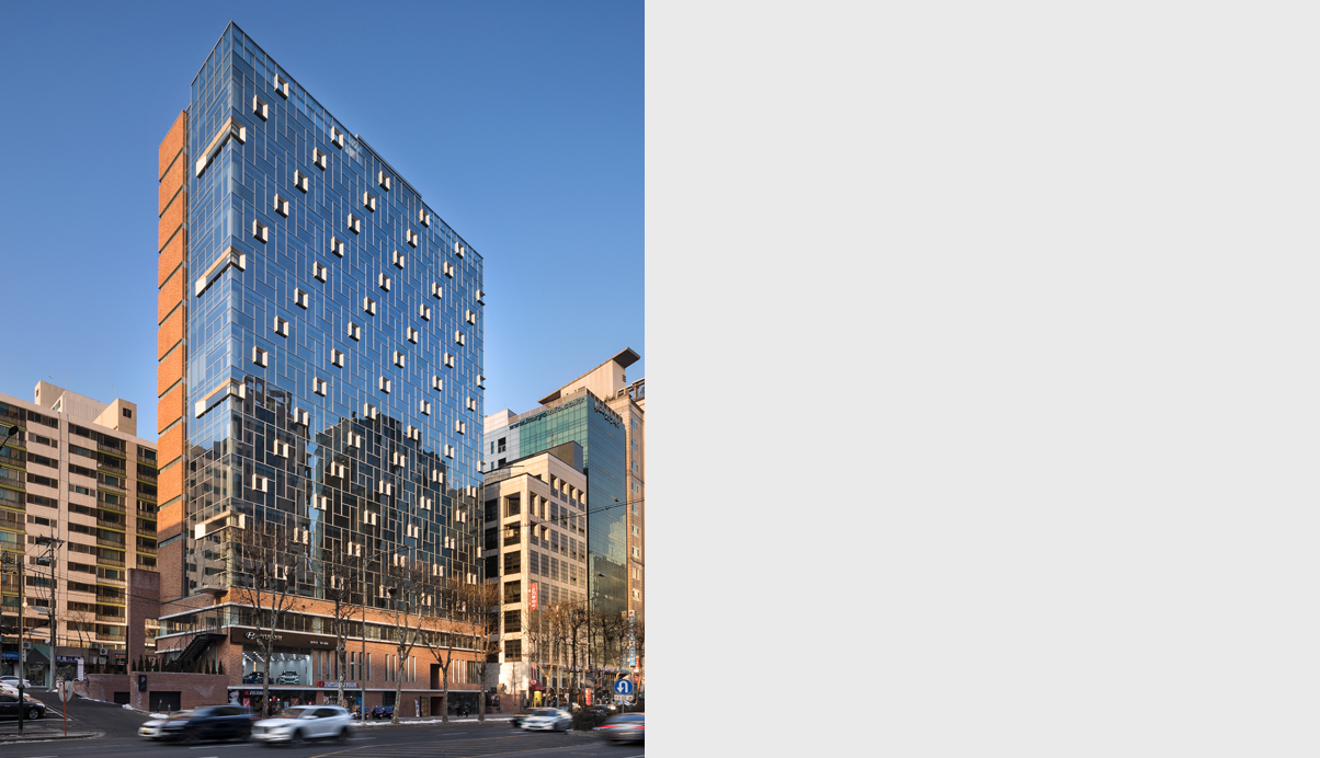 건물의 폭은 좁지만 정면은 층수와 건물길이로 보았을때 적지 않고 또 도로의 흐름에 따라 정면을 똑바로 볼 수 있는 기회는 길지 않아서 정면은 커튼월에 사각형 창호가 튀어 나온 듯한 형태의 박스를 끼워서 도로에서 속도감있게 지나쳐도 형태를 느낄 수 있도록 커튼월에 새로운 조형성을 만들어 냈다.