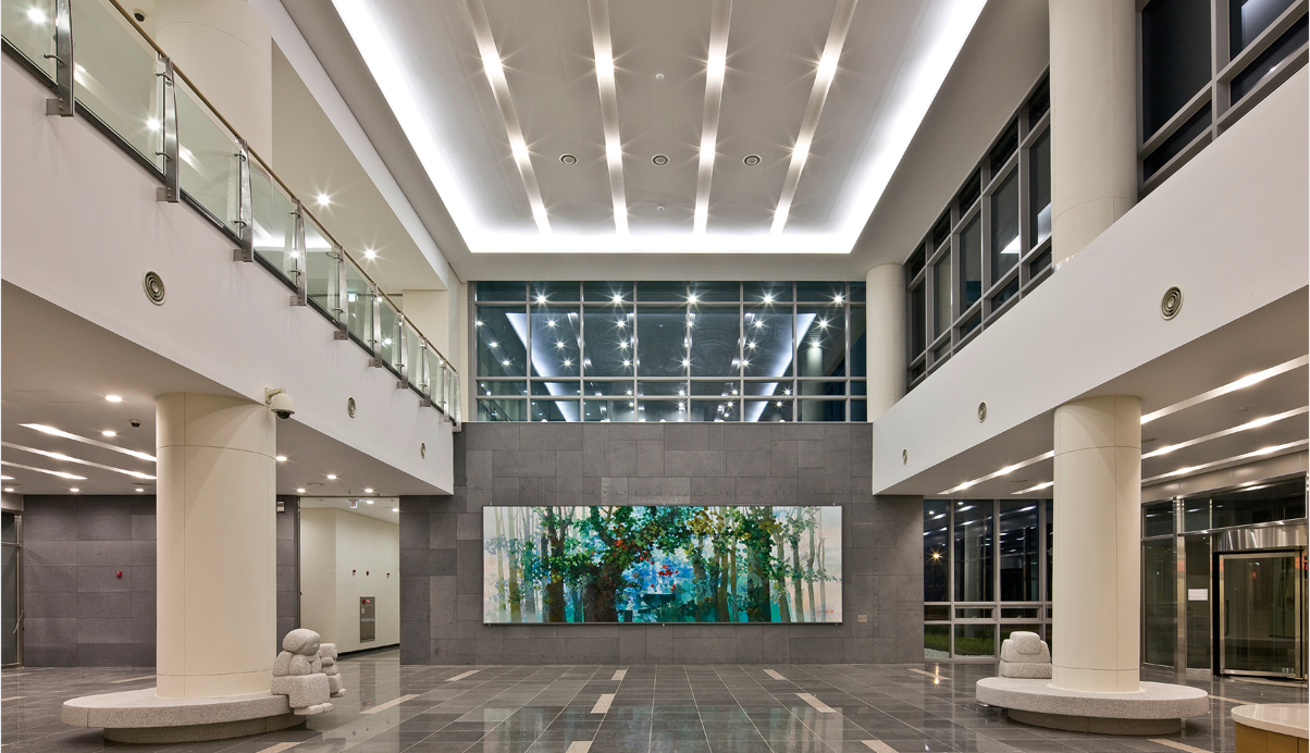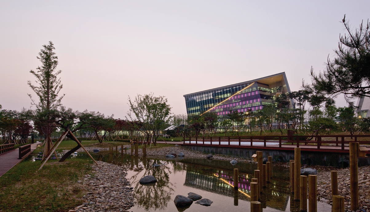 건물 사이를 열어 도시에서 자연으로 풍경을 이어주고, 건물을 들어올려 녹지와 수공간이 자연과 호흡하도록 했으며, 대지와 건물사이의 청정마루를 통해 각각의 기능이 소통하도록 했다.