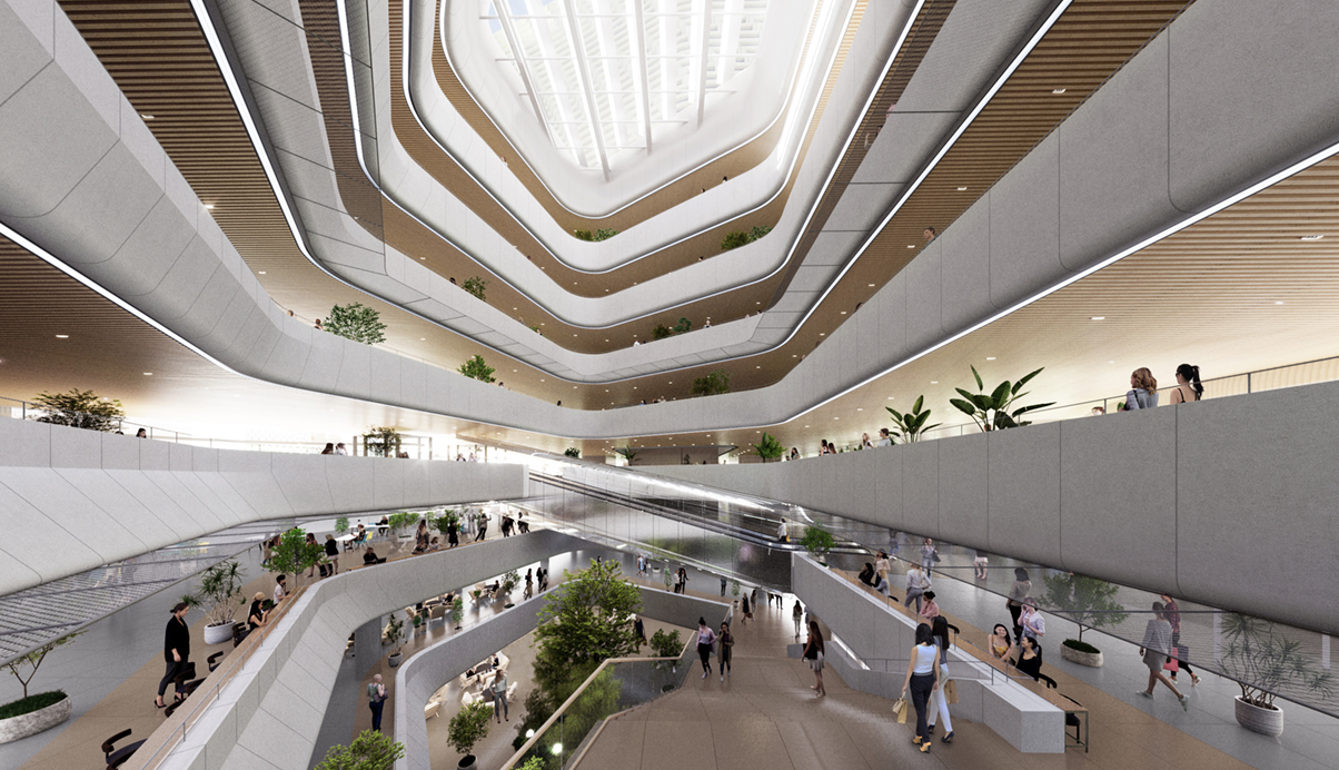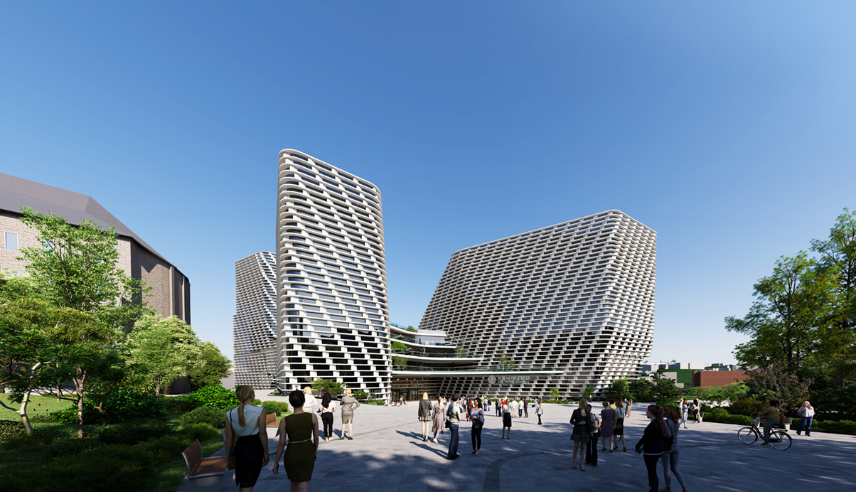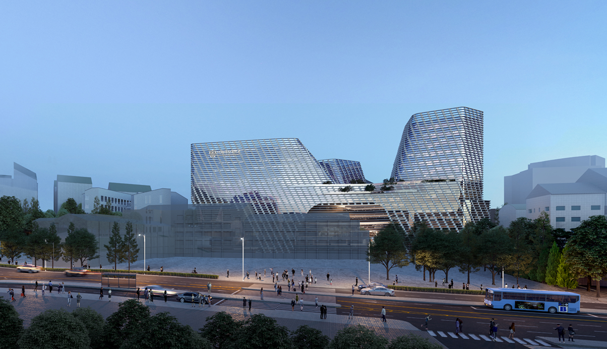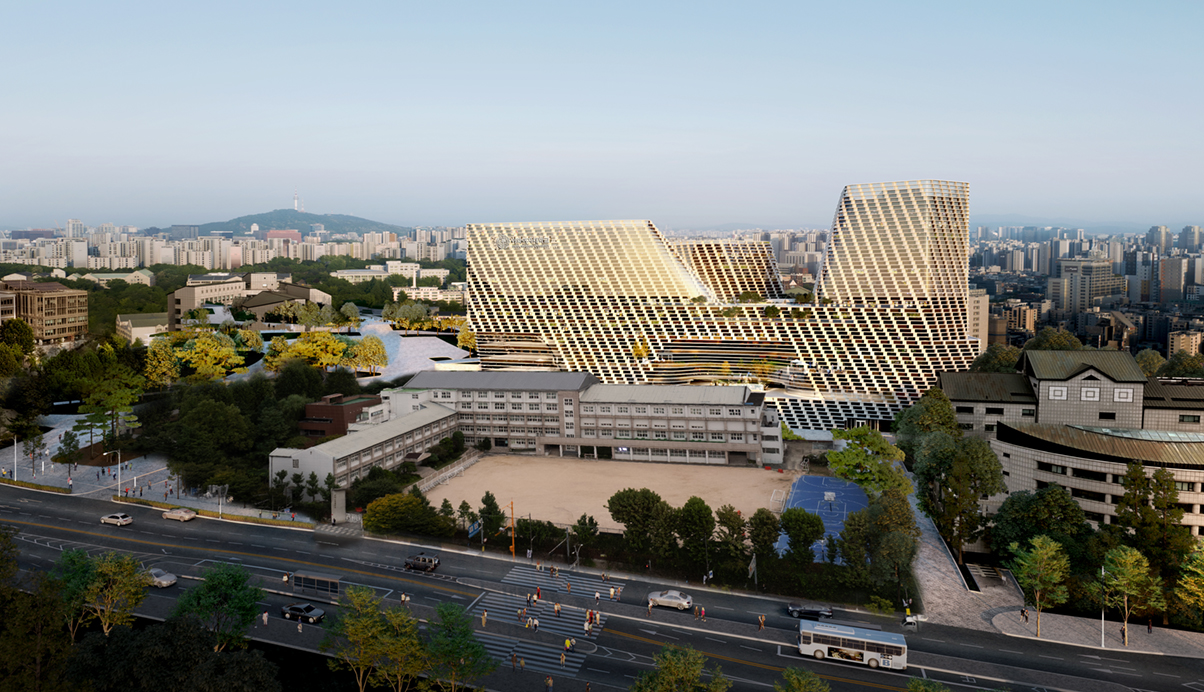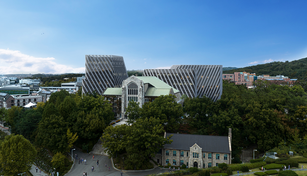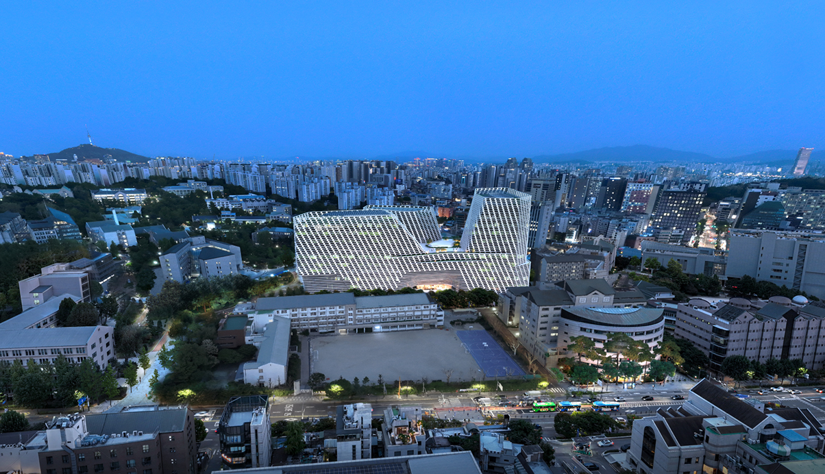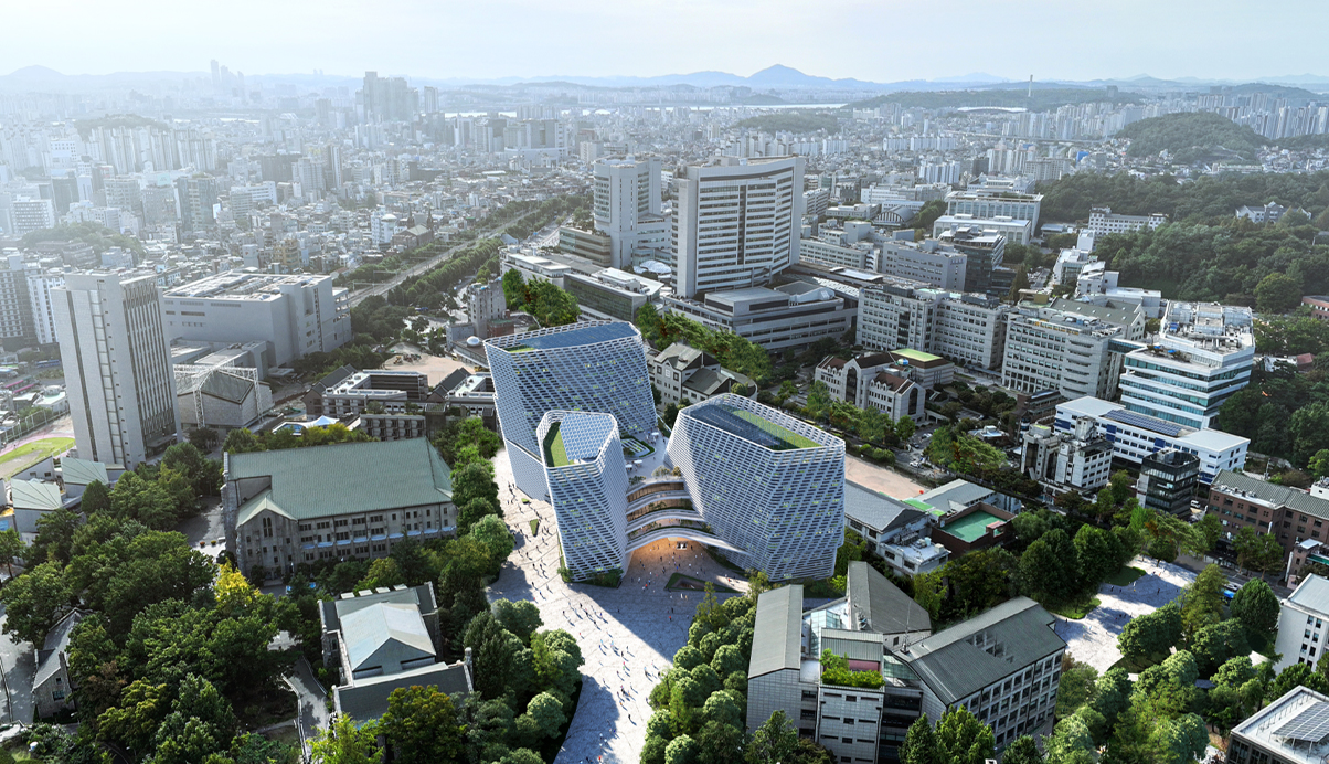 새로운 생활환경관 부지는 안산의 지세와 경사, 서로 다른 주변 질서가 만나고 충돌하는 입지로, 복잡한 캠퍼스의 맥락을 수용하는 건축적 유형을 만드는 것이 목표였습니다. 건물은 성산로의 거대한 도시장벽을 허물어 후문을 통합하는 새로운 관문으로서, 모든 사람들이 편하게 캠퍼스를 오가는 안전한 보행환경과 녹지, 그리고 미래 첨단교육, 연구, 문화, 상업 등 다양한 복합시설들로 구성됩니다. 배치의 틀은 새문과 함께 정문과 본관을 연결하는 세 개의 길, 단과대의 독립성과 정체성을 강조하는 세 개의 타워, 그리고 기존캠퍼스의 녹음을 끌어들인 외부공간인 세 개의 사이공간으로 구성됩니다. 건물 중심부에 아트리움을 두어 쾌적한 환경과 쉬운 길찾기, 다양한 교류가 일어나는 소통의 구심점이 되도록 했습니다. 건물의 조형은 오랜 역사를 지닌 대강당의 배경이 되어주면서도, 성산로에서는 새문으로서 당당한 얼굴이 되어, 모든 동문들에게 자부심을 느낄 수 있도록 했으며, 동문 한분한분을 상징하는 입면의 픽셀과 서로 연결된 수평과 사선의 역동성을 통해 미래로 도약하고 하나로 결속된 이화인의 정신과 품격을 담았습니다. 새롭게 조성되는 생활환경관은 이화여대의 새문으로서 캠퍼스 전체를 연결하는 하나의 동선체계, 그리고 방사형의 샛길을 통해 미래의 캠퍼스를 완성하게 되며, 바르고 선한 그리고 아름다운 캠퍼스의 전통과 정신을 계승하는 새로운 얼굴이자 상징이 될 수 있도록 계획하였습니다.