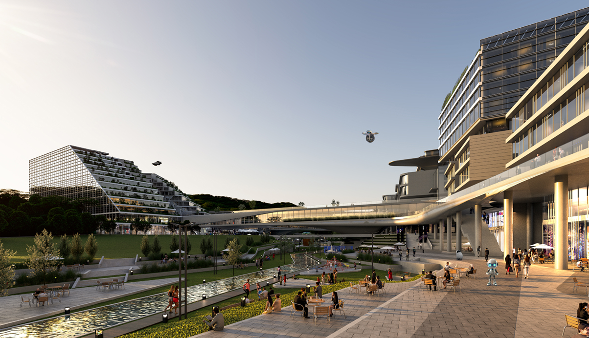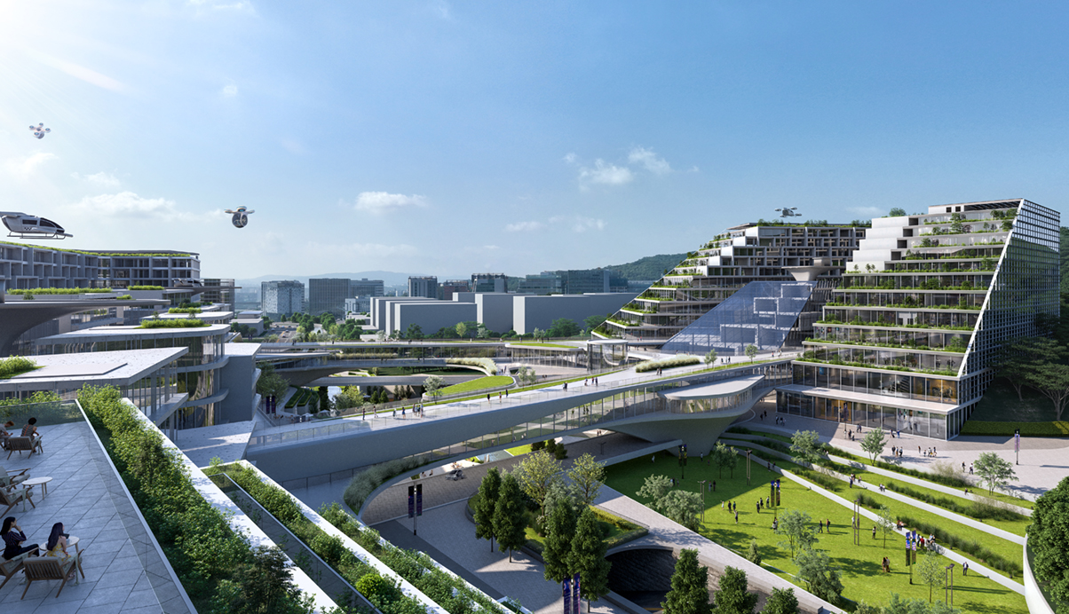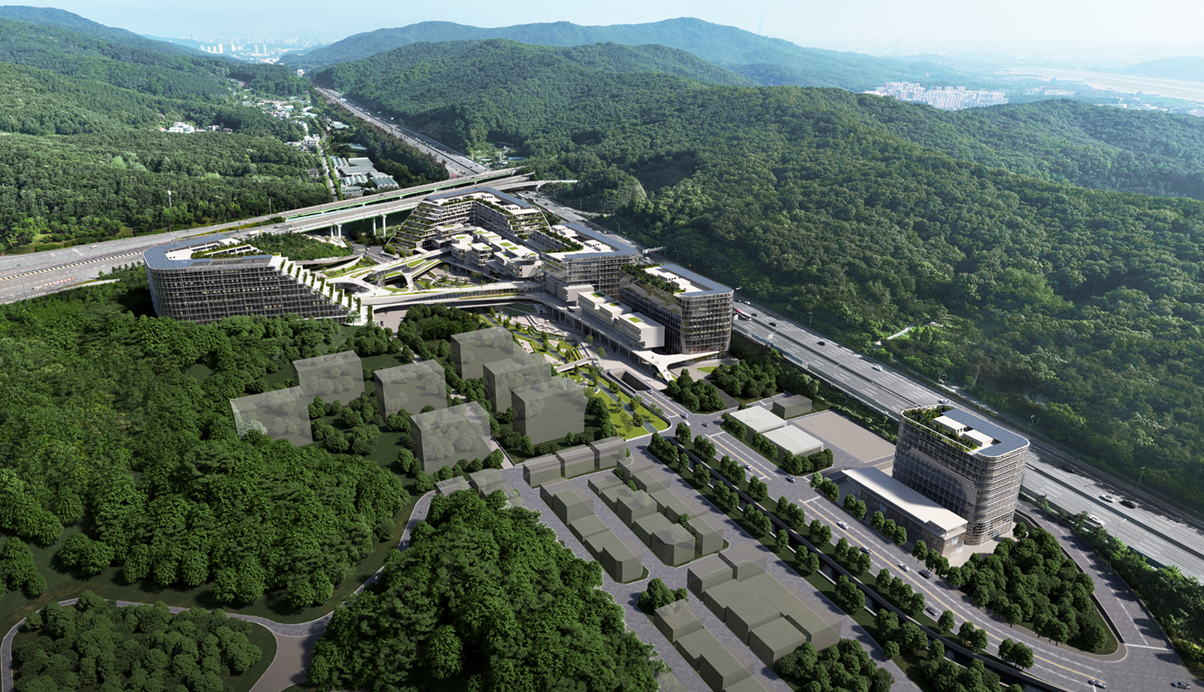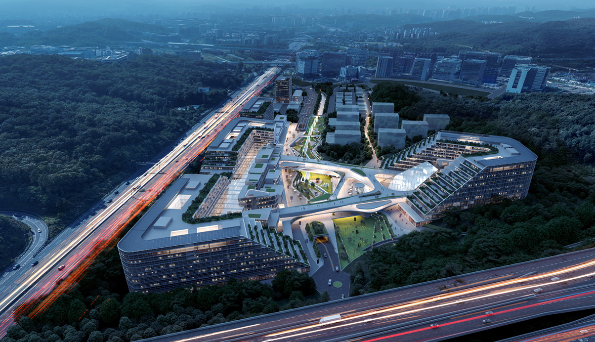 부지에 면한 두 고속도로와 자연으로 둘러싸인 환경을 마스터플랜의 기본틀로 해, 도시에 대응하는 블럭인 산업시설과 공공기숙사를 부지경계에 배치하고, 부지 중심에는 이곳을 지나가는 하천경관을 보행중심의 수변공원으로 계획해, 모든 입주자와 방문객을 위한 여가, 문화, 상업의 구심점이 되도록 했습니다. 특히, 다양한 군집형 스타트업 공간과 지원시설등 인큐베이팅 시설들이 이 수변공원과 어우러져 안락한 마을같은 휴먼스케일적 경관을 이루면서, 근생, 스타트업과 지원, 스케일업, 대학과 연구, 그리고 기숙사까지 직주락학 라이프 싸이클이 독자적으로 순환되고 운영되는 하나의 단위 클러스터를 만들어줍니다. 그리고, 이곳에 입주할 6개의 미래전략 산업분야를 세 클러스터에 담아내고, 클러스터간 서로 연결되는 플래닛 벨트를 통해, 스타트업 육성과 다양한 지원등 창업생태계가 지속적으로 활성화 되도록 했습니다.