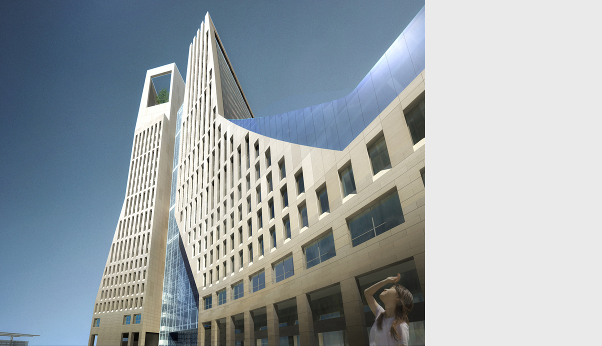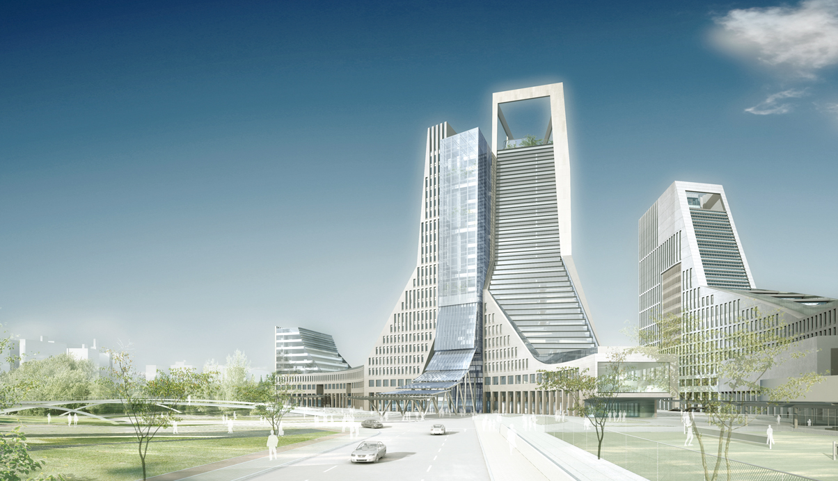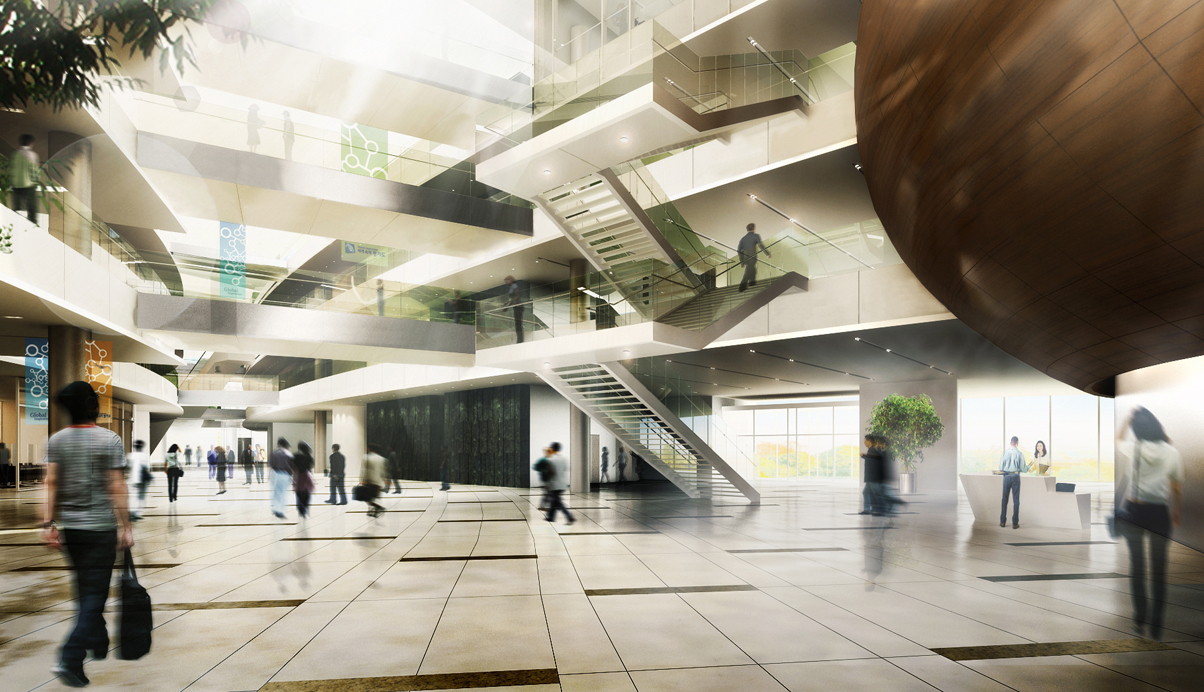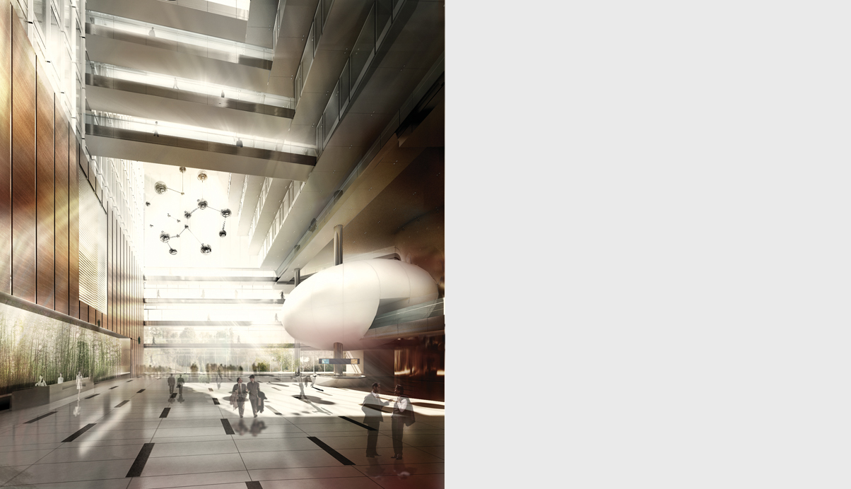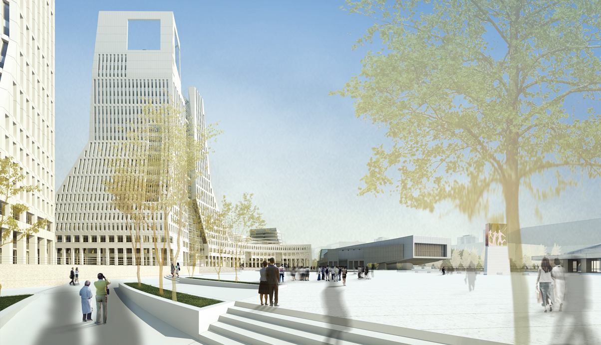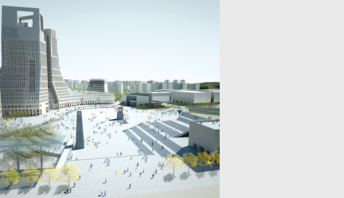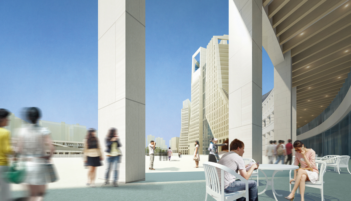 주변과의 연계를 고려하여 광장과의 관계를 유기적으로 구성하였다. 중심축인 CBD보행자 축을 따라 회랑과 아케이드로 연결되는 저층부 거리를 조성하고, 광장을 이어줌으로써 공공의 영역을 풍성하게 확대하였다. 환승센터로부터 이어지는 넓은 선큰코트를 통해 경사지를 자연스럽게 극복하며 점차적으로 광장으로 진입하게 된다.