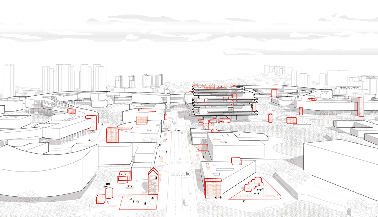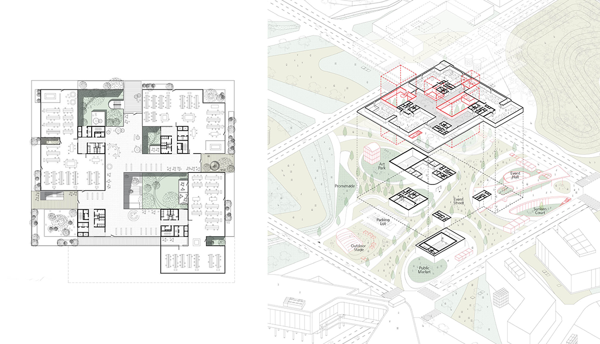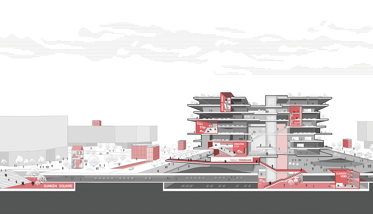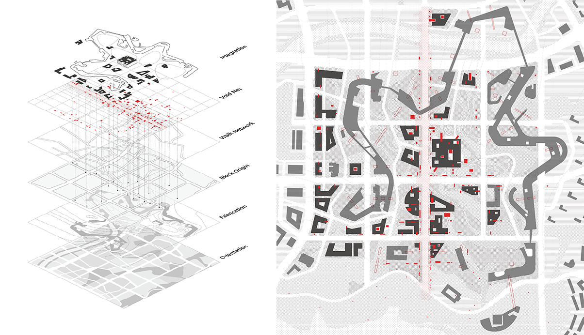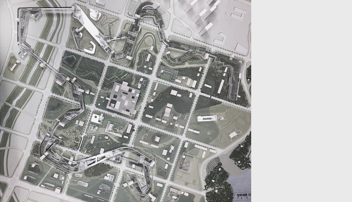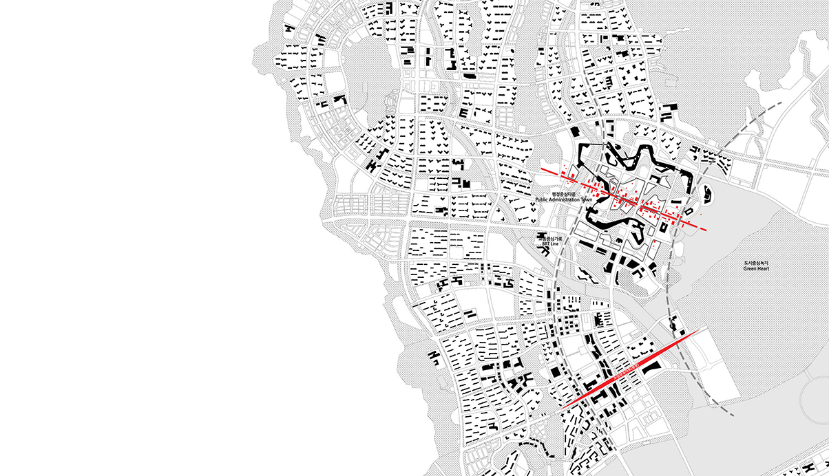 기존 세종시의 구조적 체계를 이해하고 행정복합타운의 마스터플랜으로 형성된 기존 질서에 대한 존중, 출발의 전제가 된다. 신청사의 저층부는 사방으로 광활하게 펼쳐진 경관과 도시표피흐름을 기반으로 경계없는 영역으로 채워진 공공의 녹지와 Void Net(프로그램장치)로 구성된 Void 영역의 대상지가 된다. Void Net를 기반으로 소통을 유도할 인문적 체계인 안길로 존재하면서 실질적인 가로와 광장이 형성되는 단서로서 시설물의 단선적 결합이 아닌 영역적 결합을 유도한다. 땅의 장소성을 녹지와 물의 흐름을 바탕으로 사회적 요소를 결합하고 공공매개체인 Void를 재편하여 도시계획의 용매제로 활용하였다.